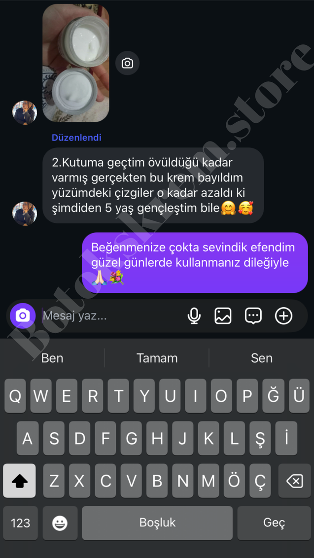 Cevap 2: Kremin etkisi anında görülür; hızlı emilim sağlayarak cilde yoğun nem kazandırır, kırışıklıkları yumuşatarak ciltte sıkılaşma hissi oluşturur ve daha canlı bir görünüm sağlar.