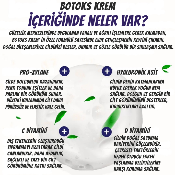 Botoks Krem, yaşlanma belirtilerini azaltmak ve cildin genç görünümünü korumak için özel olarak formüle edilmiştir.